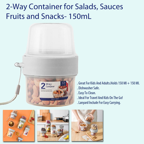 - This 2-way container can hold salads, sauces, fruits, snacks, and more. It's completely dishwasher safe, and the sealing mechanism ensures spill-free transportation.Dual-Compartment Design: Separates wet and dry foods until you’re ready to eat.