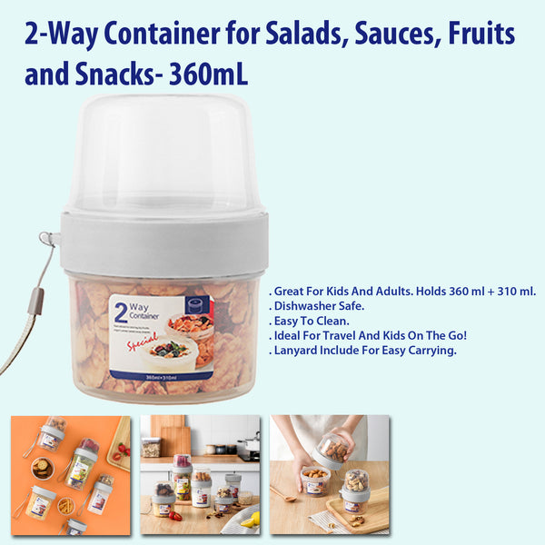This 2-way container can hold salads, sauces, fruits, snacks, and more. It's completely dishwasher safe, and the sealing mechanism ensures spill-free transportation.Dual-Compartment Design: Separates wet and dry foods until you’re ready to eat.