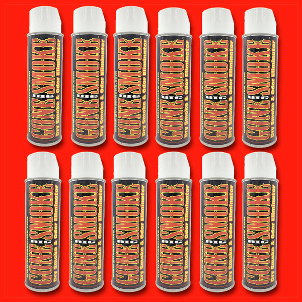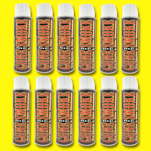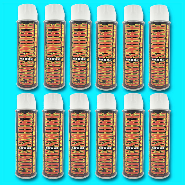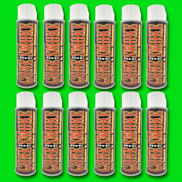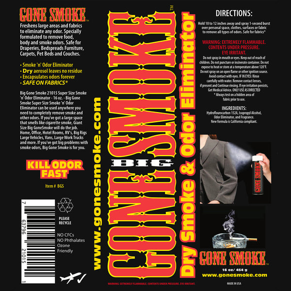 - The Big Gone Smoke Dry Smoke & Odor Eliminator comes in a 16 oz. size, available in a convenient 12-pack. With its powerful formula, it effectively eliminates smoke and lingering odors, leaving your space smelling fresh and clean.Permanent Odor Encapsulation: Dry aerosol formula chemically traps smoke, pet, and musty smells forever, preventing reoccurrence without masking or temporary cover-ups for lasting freshness.