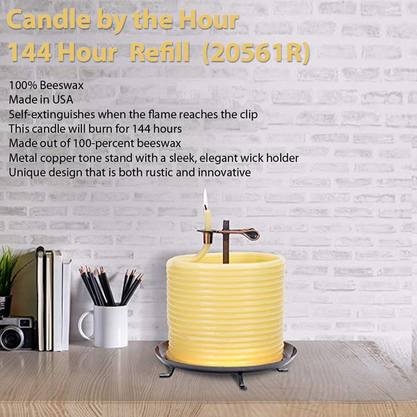 - Illuminate your nights with the Eclipse Candle Refill by the Hour 144-Hour Beeswax Coil Candle (20561B), offering stylish and dreamy illumination for hours on end. Made from 100% natural beeswax, this refill provides a brilliant light with a soft honey scent, promoting relaxation and tranquility while reducing stress and aiding sleep.Self-extinguishes when the flame reaches the clip.