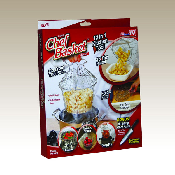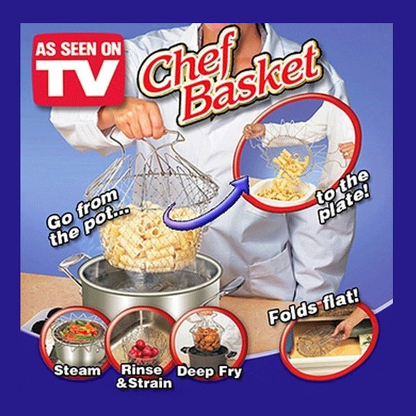 - Your ultimate culinary companion for versatile and efficient meal preparation. This innovative kitchen tool is a multifunctional powerhouse, streamlining various tasks to make your cooking experience a breeze.Expandable Design: The Chef Basket's unique design expands to a generous 12 inches in diameter, transforming it into a spacious colander or steamer basket, ideal for draining pasta or steaming vegetables with ease.