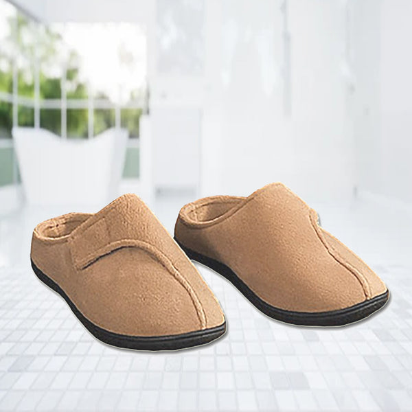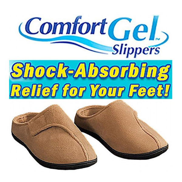 - Revolutionize comfort with Comfort Gel Slippers, designed to soothe and energize achy feet from prolonged standing. Featuring shock-absorbing gel soles, they alleviate pressure on joints and provide total comfort for indoor and outdoor use, available in Medium for men's shoe sizes 6-7 and women's sizes 8-9.Revolutionary anti-fatigue gel slippers.