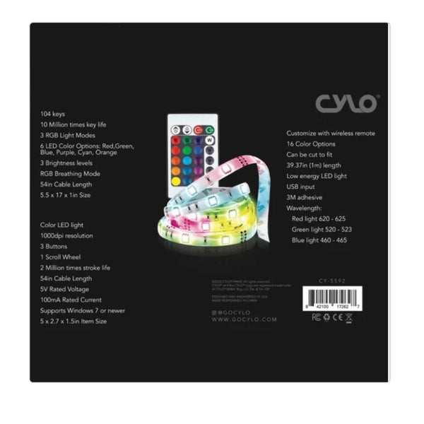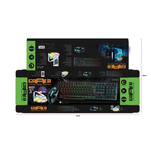 - The CYLO Gaming Set includes a high-performance keyboard, ergonomic mouse, and customizable LED light strip, designed to enhance your gaming experience with precision, comfort, and vibrant lighting. With RGB lighting modes, smooth navigation, and easy installation, this set combines style and functionality for an immersive gaming setup.High-Performance Keyboard: Features 104 keys with a 10-million keystroke lifespan and 3 RGB light modes.