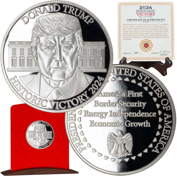 The Donald Trump 2024 Victory Commemorative Coin is a limited-edition collectible featuring a detailed portrait of Donald Trump on the front and his vision for America on the back. It comes with a protective display case and a certificate of authenticity, making it a notable item for collectors.Historical Keepsake: Captures a moment in political history, making it a valued addition to any memorabilia collection.