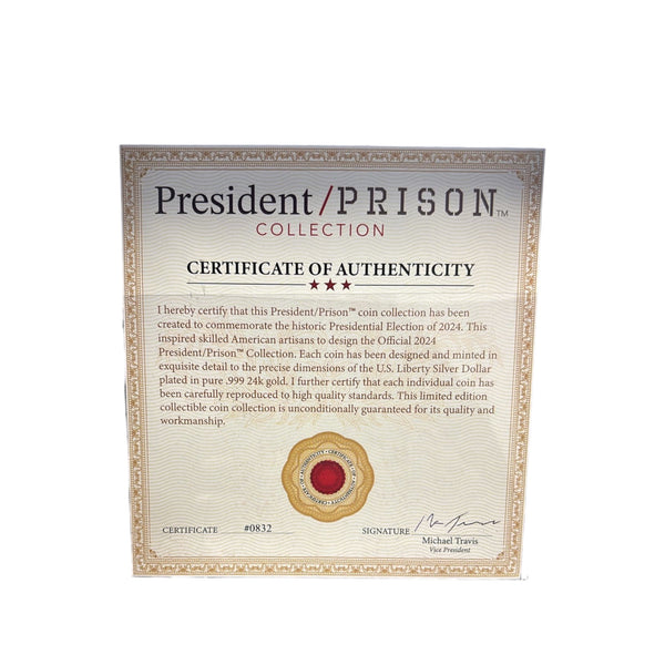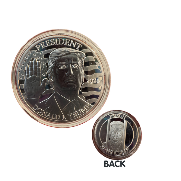 - Make a bold statement with the Donald Trump: President or Prison – Silver-plated Edition collectible coin. This eye-catching, gold-layered piece sparks conversation and captures a defining moment in modern political history.Historical Keepsake: Captures a moment in political history, making it a valued addition to any memorabilia collection.