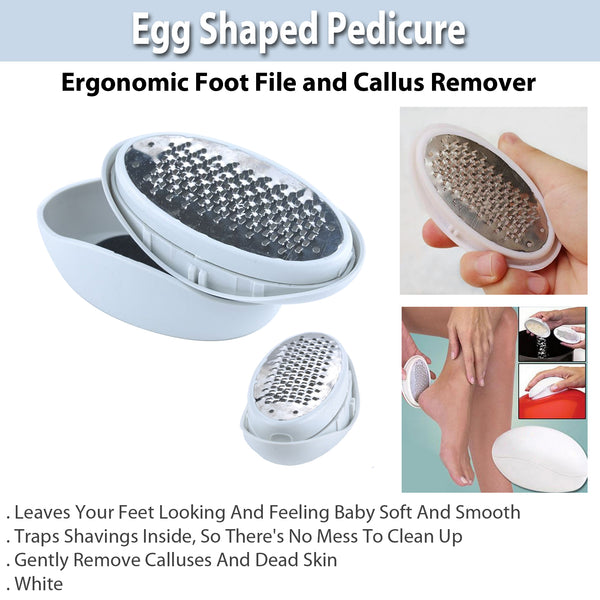 - The Egg Shaped Pedicure Ergonomic Foot File and Callus Remover is designed to provide a comfortable grip and effective exfoliation for your feet. Its unique egg shape allows for precise control, making it easy to remove calluses and dead skin, leaving your feet feeling soft and smooth.Ergonomic Design: The egg-shaped design of our foot file fits perfectly in your hand, providing a comfortable grip and optimal control while you pamper your feet.