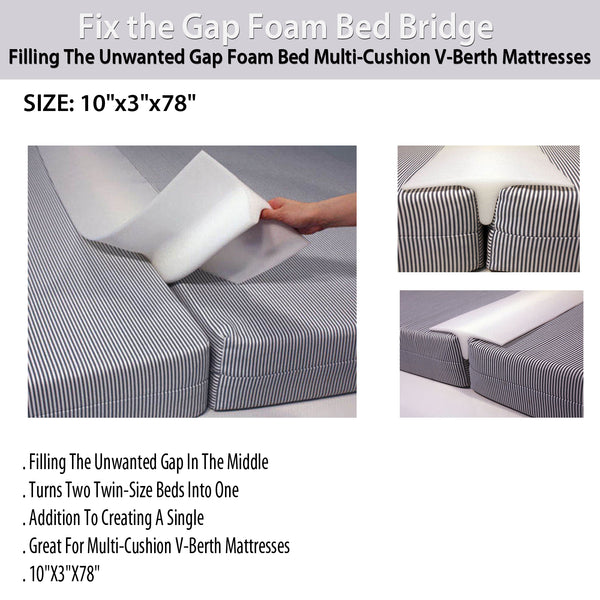 - The Fix the Gap Foam Bed Bridge, measuring 10 inches by 3 inches by 78 inches, offers a seamless solution for uninterrupted sleeping. This innovative product ensures a smooth and comfortable transition between mattresses, enhancing your sleeping experience.Designed to fully cover the gap between two mattresses, you'll love sleeping in your bed again.