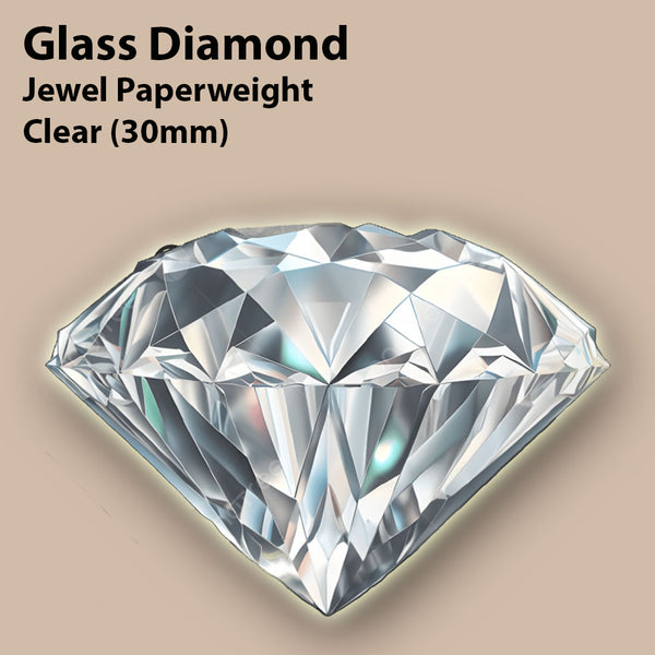 - The Glass Diamond Jewel Paperweight in Clear (30mm) is a stunning and multifunctional decor piece that adds elegance to any space. Its crystal-clear design and diamond-cut facets catch and reflect light, creating a mesmerizing display. Whether used as a paperweight on a desk or as a decorative accent on a shelf, this glass jewel adds a touch of sophistication and sparkle to any room.Clear Color Glass Paperweight, party favor or wedding decoration