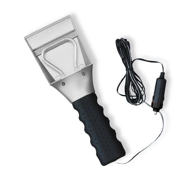 - The heated ice scraper gets your car ready in the winter. Designed to plug into a 12V port, the scraper quickly heats itself and reaches to melt away obscuring windshield ice buildup.Efficient De-Icing: The Windshield Ice Scraper's electric heating element melts and loosens ice, allowing it to slide off safely.