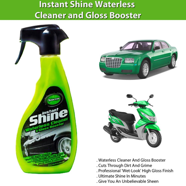 - Achieve a brilliant shine with the Instant Shine Waterless Cleaner and Gloss Booster, designed for effortless cleaning and enhancing your vehicle's finish. This innovative formula removes dirt and grime while leaving a protective layer that enhances gloss, making your car look showroom-ready without the need for water.Waterless formula allows for easy cleaning without needing a water source.