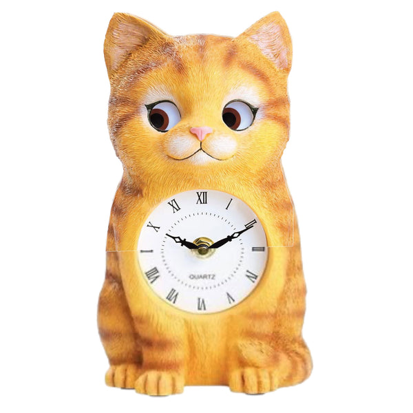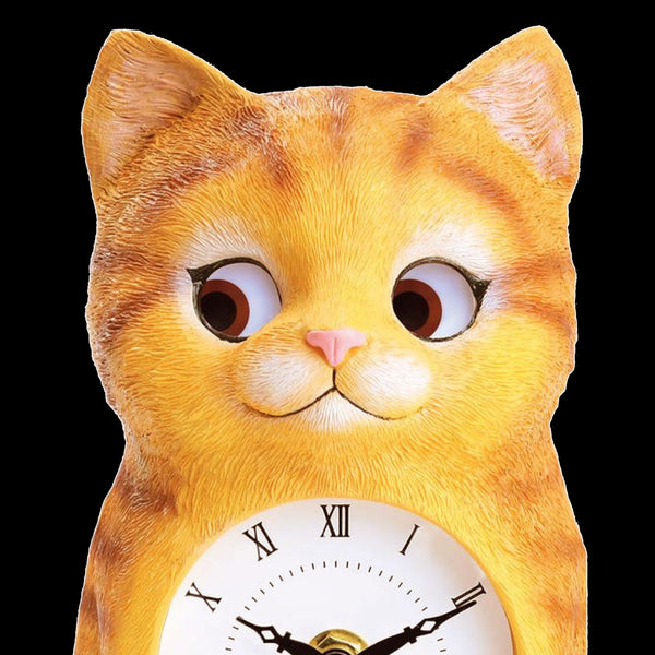- Up the cuteness factor in your home with this hand-detailed resin clock. It's eyes tick tock back and forth for added fun. Quartz movement.Whimsical and charming cat-themed wall clock.