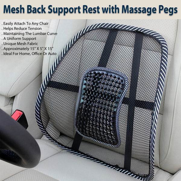 - Ideal for home, office or auto, this Mesh Back Support features a lightweight design with cool, breathable mesh and embedded massage pegs. Designed to easily attach to any chair, it gently conforms to your body's contours for uniform support.Gently conforms to body contours for a uniform support.