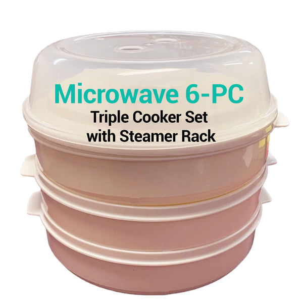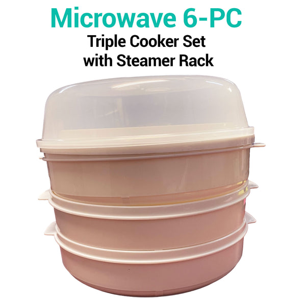 - 6-piece Triple Cookware Set is an integrated microwave cooking system that consists of 3 separate dishes, a steam rack and two lids (flat and high lids). They can be used individually, 2 at a time or all together.Includes 3 separate dishes, steam rack, and flat and high lids.