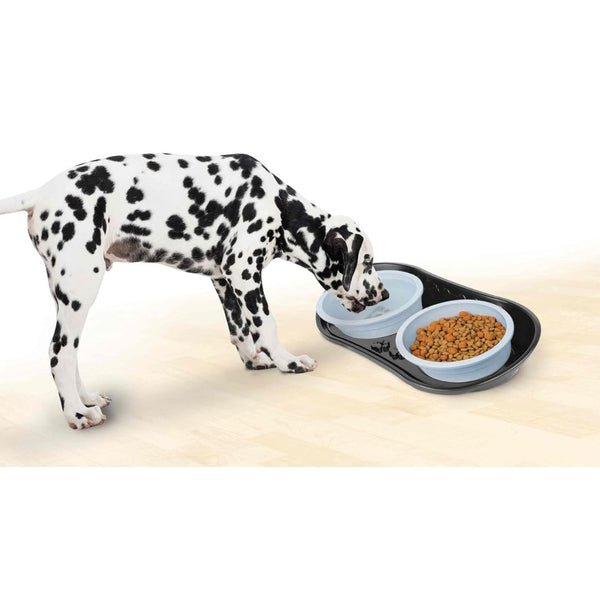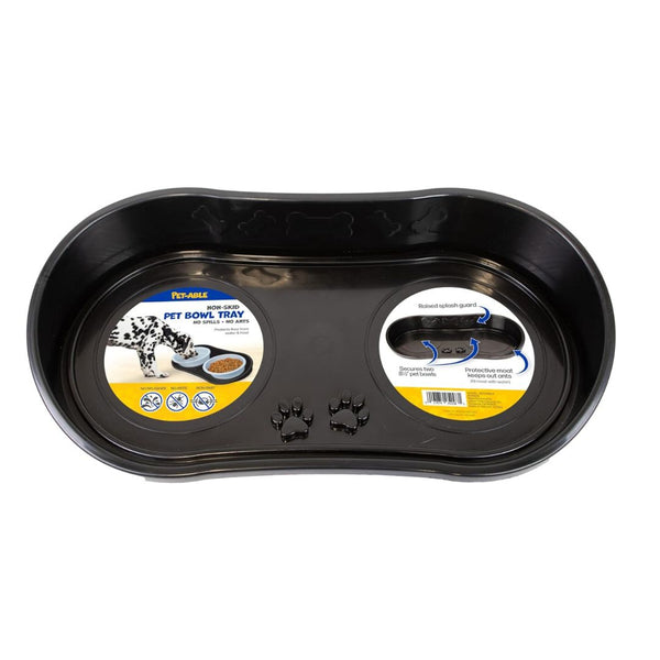 - Keep your floors clean and mess-free with the Non-Skid Pet Bowl Tray. Designed to hold pet bowls securely in place, this tray prevents sliding and spills during mealtime.Secures 2 pet bowls up to 8.5" in diameter (pet bowls not included)