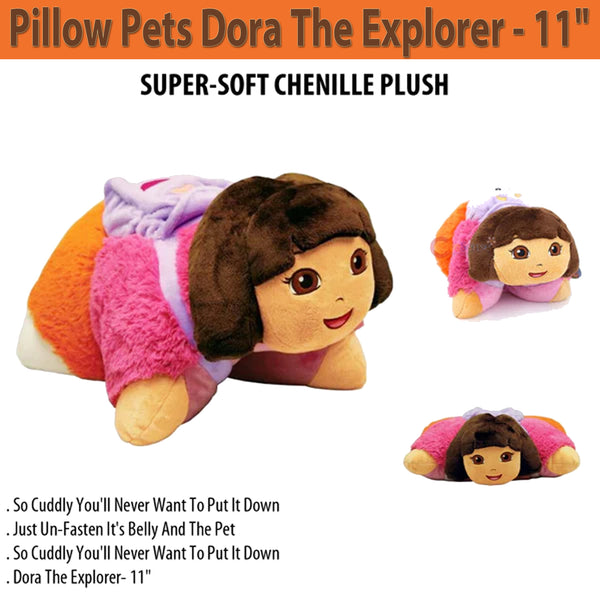 - The Pillow Pets Dora the Explorer is an 11" plush toy that transforms into a cuddly pillow, perfect for kids who love Dora's adventures. Soft and versatile, it offers both a comforting companion and a functional pillow for naps or bedtime.Transformative Design: Converts from a plush toy into a cozy pillow.