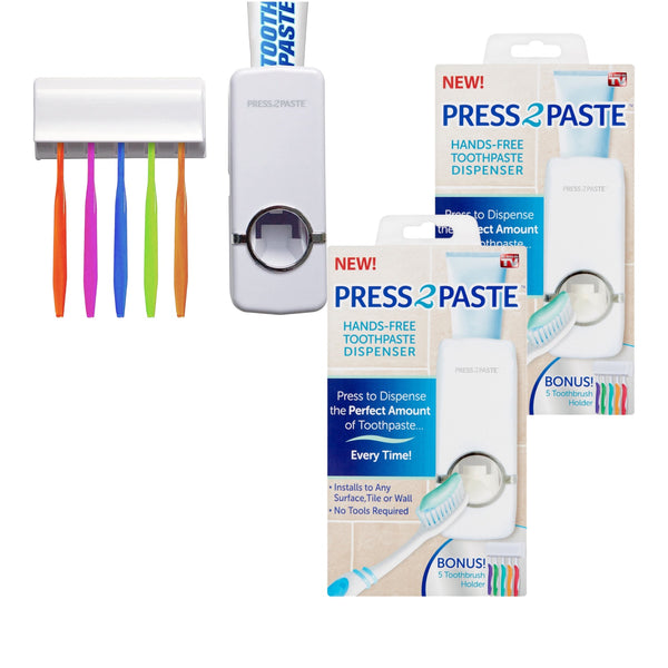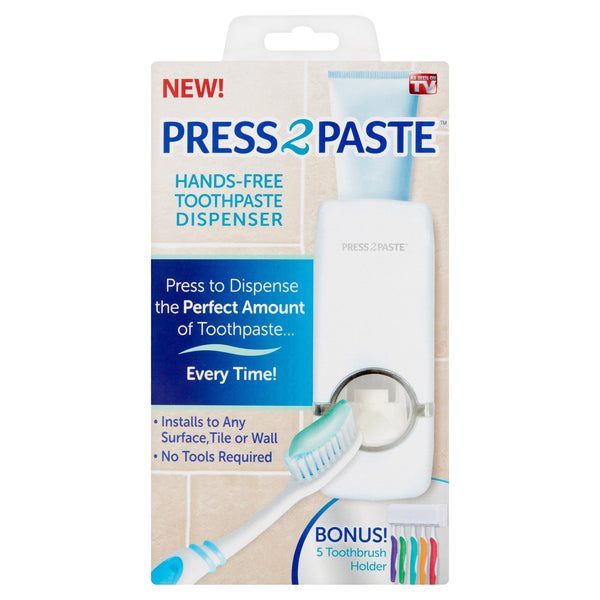 - The Press 2 Paste Hands-Free Toothpaste Dispenser: Streamline your morning routine with this innovative device, designed to dispense toothpaste effortlessly. With its hands-free operation and sleek design, it's a convenient addition to any bathroom for hassle-free oral care.Fits any size tube and dispenses to the last drop.