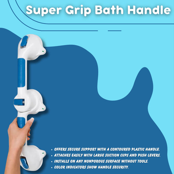 - The Super Grip Bath Handle provides secure support in the shower or bath with its contoured plastic handle and large suction cups that attach easily with push levers. It mounts on any nonporous surface without the need for tools, and color-changing indicators show if the handle is securely in place.Color-changing indicators show if the handle is securely in place.