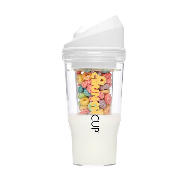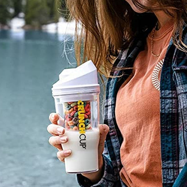 - CrunchCup XL Portable Cereal Cup. Designed with dual chambers to keep milk and cereal separate until you sip, this spill-resistant cup makes breakfast convenient anywhere. It holds about 1.6 cups (364 ml) of cereal.The perfect companion for any student, parent, or business professional who wants to take their cereal to-go.