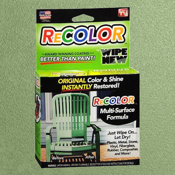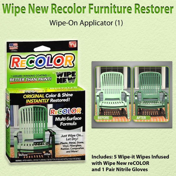 - The Wipe New Recolor Furniture Restorer with a wipe-on applicator revitalizes and restores the appearance of your furniture, bringing back its original color and shine. Its easy-to-use formula enhances and protects surfaces, making it ideal for renewing the look of worn or faded furniture.Original Color Restoration: Effectively restores surfaces to their original color for a perfect match every time.