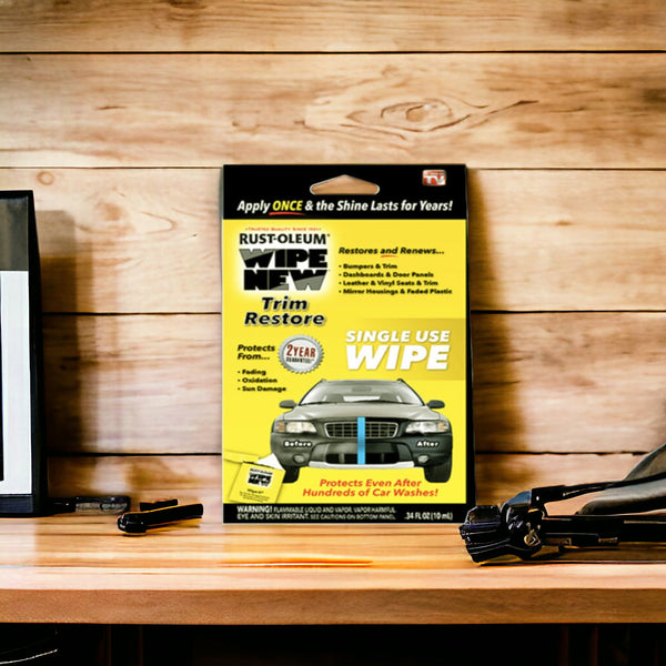 - Wipe New Trim Restorer comes with a convenient wipe-on cloth applicator, providing a simple solution for restoring faded trim and plastic surfaces. With 0.34 fl. oz. of the effective formula, it revitalizes your vehicle's appearance while offering protection against UV damage.Convenient Wipe-On Applicator: Easy-to-use cloth applicator for hassle-free restoration of faded trim and plastic surfaces